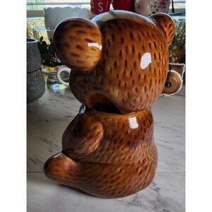 This vintage ceramic honey bear jar is as sweet as the honey it's made to hold! Featuring a classic teddy bear shape with a glossy brown glaze, yellow paw accents, and a honey pot belly, this piece adds a touch of retro charm to any kitchen or shelf.