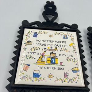 Tile "no matter where i serve my guests it seems they like my kitchen best" is not connected to cast iron trivet as pictured, could easily be re glued.