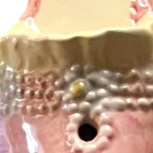 Adorned in delicate hues of pastel pink, purple, blue, yellow, and green, this vtg ceramic trinket box is finished with a glossy glaze that adds soft shimmer to its dreamy design. The lid features a 3D pair of high-heeled mules, embellished with tiny flowers, embossed polka dots in green, white, and pink, and a frilly ruffled top with a charming cutout. A beaded lavender border circles the lid for a touch of extra whimsy.