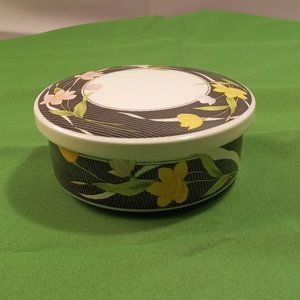 Vintage Ceramic trinket box made in Korea, 5" diameter, has one tiny chip on bottom see photo.