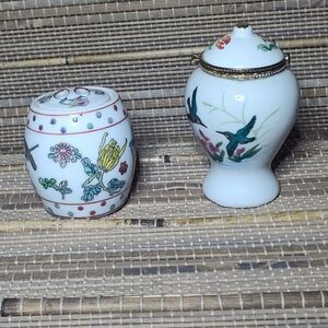 Charming ceramic trinket jars. One features a floral design. The other showcases birds. Perfect for small keepsakes.
