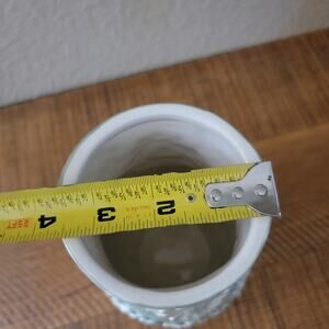 This vintage ceramic vase features a beautiful seafoam aqua glaze accented by raised white floral appliqués that cover the body in a dimensional pattern. Standing approximately 8.25 inches tall with a 3.25-inch mouth opening, the vase has a rounded form that gently tapers at the base for balance. The combination of soft pastel tones and textured floral relief makes it both decorative and versatile, perfect for displaying fresh or dried flowers or serving as a standalone statement piece. The glossy glaze highlights the detailing of the appliqué flowers, giving the vase a delicate, handcrafted quality often associated with mid-20th century ceramics. In excellent vintage condition with no chips or cracks, this vase adds charm to a variety of settings, from shabby chic and cottage interiors to eclectic or traditional collections. A decorative and collectible piece with timeless appeal, ideal for lovers of textured ceramics and floral-inspired designs.