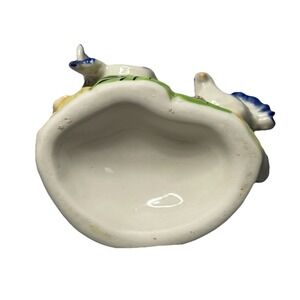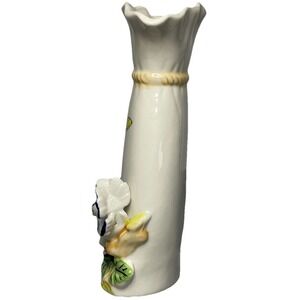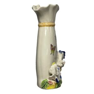 Charming vintage ceramic vase with delicate butterfly designs and raised applied details of two white doves accented in blue, perched among green leaves with a pink rose. A lovely collectible accent piece for cottagecore, shabby chic, or vintage-inspired décor.