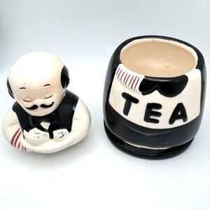 This vintage ceramic tea canister in a charming waiter motif adds character to kitchens or collectibles. Functional and decorative with a secure lid.