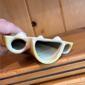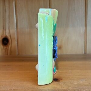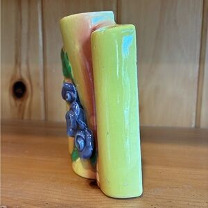 Vintage Ceramic Wall Pocket with Roses Yellow pillar flanked with a bow of blue roses and green leaves.