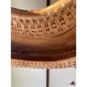 This beautiful ceramic wall-hanging basket flower vase is likely from the 1980s. It's in perfect condition and about 11" long. This would be perfect with dried lavender, a floral arrangement, or even succulents (imagine string of pearls!). It currently does not have anything on the back to hang it but that could easily be remedied. I recommend the Flatiron's brand disc hangers (available on Amazon) that adhere to the back of ceramic.