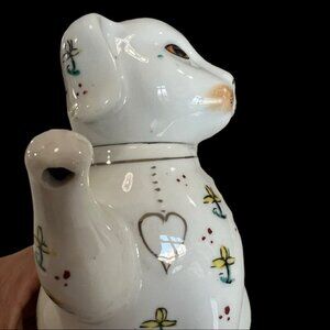 Vintage Ceramic Puppy Dog Teapot/Creamer measuring 5-3/4" tall. Dog is in great vintage condition with no chips or cracks. There are a few dots of the green paint on the face and I am not sure if they were intentional.