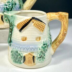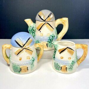 Vintage Ceramic Windmill Tea Set Made in Japan Hand Painted Teapot Sugar Creamer