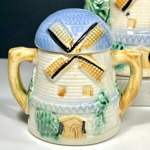 Vintage Ceramic Dutch Windmill Hand Painted Tea Set Made in Japan. Beautiful Dutch Windmill design on each piece, hand painted cottage ware style in with great details in each piece. This set includes the teapot, covered sugar and creamer. Each piece is marked "Japan" on the bottom.