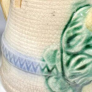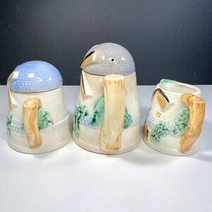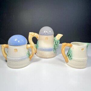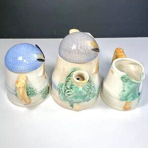The teapot measures 4 3/4" high x 6" long x 3 3/4" wide. The covered sugar measures 4" high x 4 1/2" long x 3 1/4" wide. The creamer measures 3" high x 3 3/4" long x 2 3/4" wide. All are in good condition free of any chips or cracks. ALL pieces do have some crazing and the teapot has very heavy crazing in the glaze and discoloration. Please see all pictures for condition. A fun set perfect for any tea set collector, to put on display and would work well with any country or cottagecore décor.