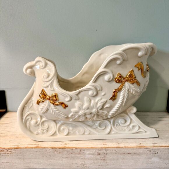 Vintage Ceramic Winter Christmas Sleigh | Elegant Gold Detail