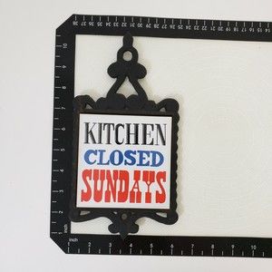 Vintage Ceramic Wrought Iron Trivet Kitchen Closed Sundays 7 star Made In Taiwan
