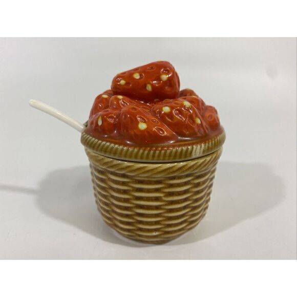 Vintage Ceramic Strawberry Sugar Bowl Jelly Jam Jar w/Lid & Spoon Japan 4.25”.