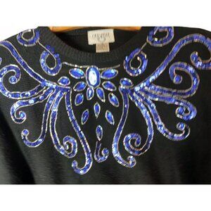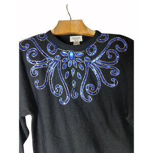 Vintage Cervelle Black Sweater Blue Sequin Bead Size S Oversized Bejeweled