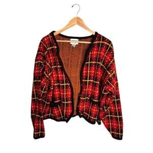 This colorful vintage plaid knit cardigan features: