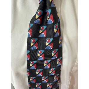 Elevate your accessory collection with this vintage Cezani silk tie, featuring a retro geometric pattern in bold colors—perfect for adding flair to both casual and formal looks. Crafted from luxurious 100% silk, it is a timeless piece from a renowned tie maker. The tie is in excellent vintage condition with no visible damage.
