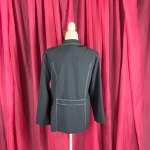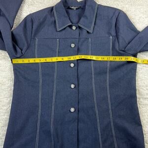 Blue button down shirt with patch style bust pockets and pointed collar. Silver button hardware and flattering horizontal stripe detail in front. Small pads in shoulders that are not sewn under the fabric, so easily removable should you choose. Shirt is not lined, and doesn't have much for stretch. Made in the USA.
