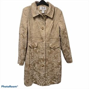 Gently worn, excellent condition, only flaw is a black mark on the back of the collar. Beautiful beige tapestry with quilted lining for extra warmth. Button front closure and pockets. Measures 21” armpit to armpit and 37” shoulder to hem.