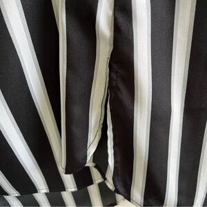 This is a great mid to late 80’s Chadwick’s of Boston sleeveless, crisp white and black striped tunic tank top. Vertical stripes in combination of a v-neck helps to elongate the body as well as a slit on each side.