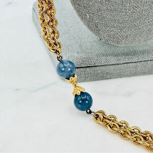 Vintage Chain and Bead Necklace Blue and Gold Barrel Clasp Detail End Ca…