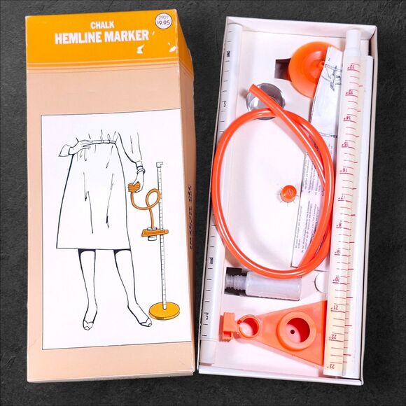A rare survivor from the golden age of home sewing! This vintage chalk hemline marker (Model No. 2901) was made in West Germany and comes complete in its original box with instructions. The marker appears unused chalk has never been opened, stand parts are clean, and the delicate instruction sheet is still intact.