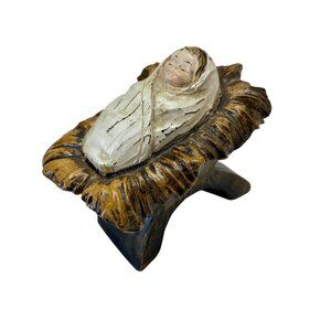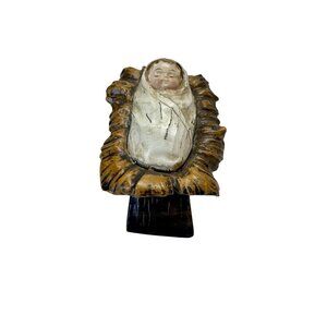 Beautiful vintage chalkware Baby Jesus figurine, featuring hand-painted detail and a rustic carved manger design. This small 3" × 2" piece captures classic nativity charm with warm earth tones and delicate facial features. Ideal as a replacement figure, collectible accent, or devotional Christmas display.