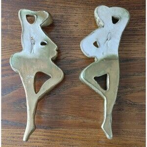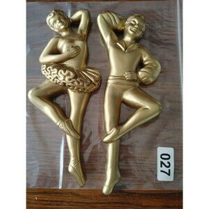 This Vintage Chalkware Ballet Dancers Wall Art Set features two 12-inch plaques depicting male and female dancers in a classic Mid-Century Modern style. The gold-colored chalkware figures showcase intricate details and a 3D effect, perfect for any room in your home. With a retro theme inspired by 1950s ballet and dance, these wall decor pieces are ideal for collectors and anyone looking to add a touch of elegance to their space.