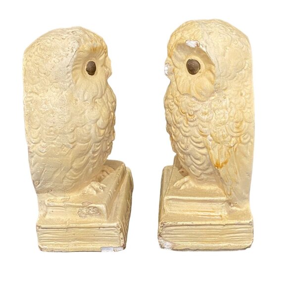 Vintage Chalkware Knowledge Owl Bookends 6" Beige Birds Bookworm Home Decor