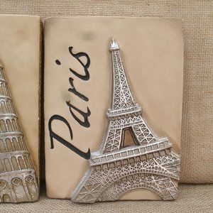 tags: plaque, wall hanging, chalkware, pisa, paris, france, french, italy, italian, decor, display, collectible, europe, eiffel tower, leaning tower, handpainted, vintage