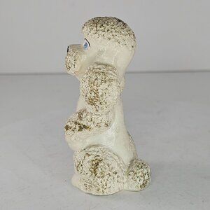 Charming vintage Chalkware poodle figurine with a white and gold finish, featuring cute blue eyes. A lovely addition to any home decor collection.