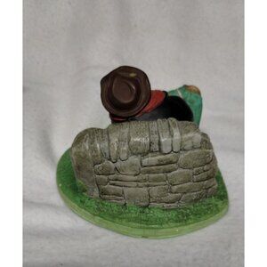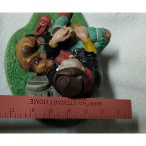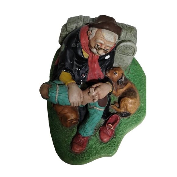 Hand-painted vintage chalkware figurine featuring a homeless man and his dog, resting at a traveler's rest. This vibrant, multicolored ceramic piece measures 7" and comes from unbranded origins, adding to its unique charm.