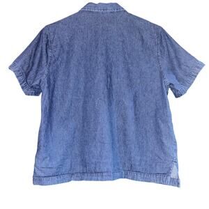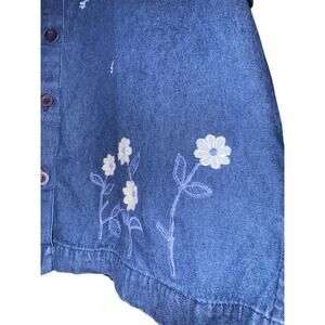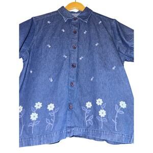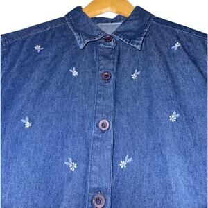 Vintage Chambray Embroidered Floral Top Button Up Women Large Daisy 90s Prairie