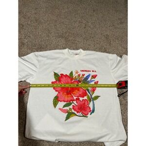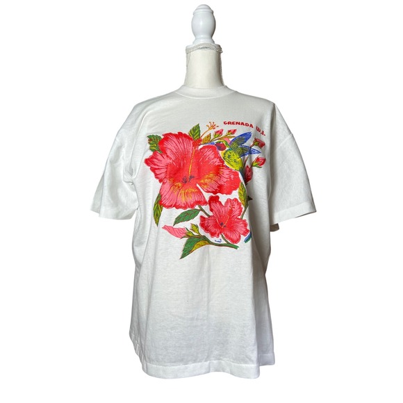 Keywords: vintage t-shirt, graphic tee, Grenada, Caribbean, floral, hummingbird, island souvenir, vacation tee, retro style, tropical, 90s fashion, Champ, W.I., white t-shirt