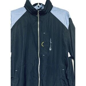 Vintage Champion Full Track Suit Jacket / Pants w Roll and Tuck Hood & Reflector Stripes on lower leg of pants - Navy & Powerder Blue Combo with Yellow Accents - Elastic Cinch Bands on Jacket - Hand Pockets and Zippered Chest Pocket - C Logo zipper pull - Pants have standard pockets and leg pockets Made in Macau - Size Medium