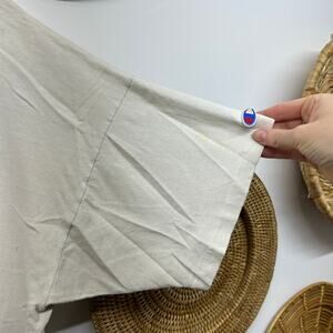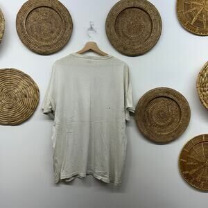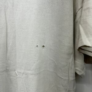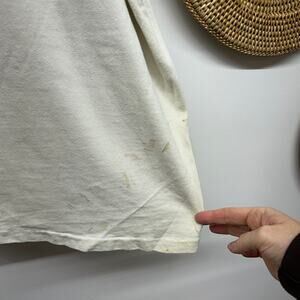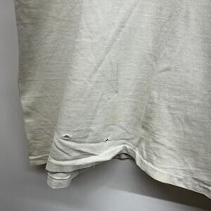 This shirt is very worn in and includes discoloration, frayed neckline, small holes and sleeve logo partially loose. It has that worn in vintage look and feel. Lots of life left.