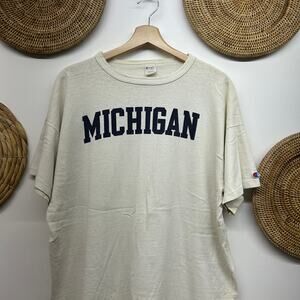 Check out this awesome vintage Champion Michigan T-shirt! It's a men's size XXL and features a cool white and blue design. Perfect for any fan of the Wolverines or vintage sportswear.
