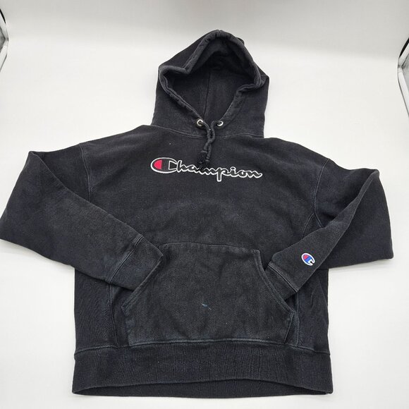 Vintage Champion Reverse Weave Black Hoodie Medium Sweatshirt Embroidered Logo