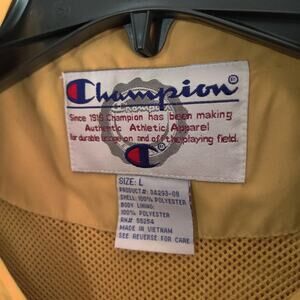 Embrace a retro vibe with the vintage Champion windbreaker jacket, tailored for a comfortable fit in a classic size L. Its vibrant yellow hue, accented with navy details, makes for an eye-catching addition to your activewear collection. Ideal for a range of activities, from running and jogging to walking and gym training, this lightweight jacket is designed to keep you covered without weighing you down.