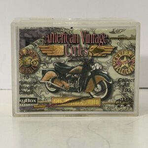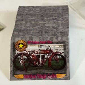 This is a box of trading cards featuring vintage motorcycles. The set is open but cards are in excellent condition. Cards with bikes like Harley Davidson, Excelsior, Indian, Henderson. Comes with case. Pre-Owned-Excellent condition.