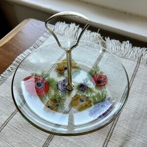 This vintage Chance Glass tidbit tray features the lovely and collectible Anemone Flowers pattern, showcasing delicate floral design in soft tones. With a mid-century modern aesthetic, it's perfect for serving small treats or as a charming trinket or vanity dish.