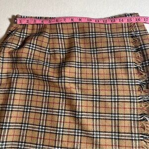 Vintage wool blend flannel faux wrap skirt. Tan, black, white, red with fringe detailing. Hidden zipper. Lined.