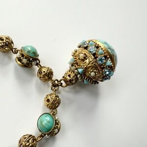Vintage Chanel bracelet circa the late 1950s or early 1960s with turquoise glass cabochon beads, gilt filigree work, micro faux pearls, and a gorgeous turquoise glass cabochon fob with prong-set rhinestones, glass stones, and faux pearls. About 8 1/4” inches or so in total length, including the extender chain. Unsigned, from the early days of Chanel when Coco was still alive, and so before Chanel began marking all of their jewelry. I’ve had it professionally authenticated and will pass certificate information on to the buyer, and then of course anything over $500 goes through Poshmark authentication as well. Wear consistent with age and use - the most noticeable wear to my eye is one of the small blue triangular glass stones on the fob is missing, and to the finish on some of the micro faux pearls. Gorgeous collectors’ piece.