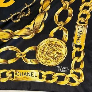 This iconic vintage Chanel silk scarf showcases the brand's timeless elegance. Featuring a bold black background adorned with gold-tone chain links and medallions inscribed with "31 Rue Cambon Paris," this scarf embodies the essence of Chanel's Parisian heritage. The luxurious silk fabric offers a smooth finish, and the hand-rolled edges attest to its high-quality craftsmanship.