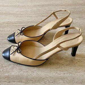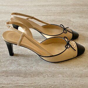 Vintage Chanel beige and black leather CC bow cap toe slingback heels. Size 38 C. Heel height is approx 2.75 inches.