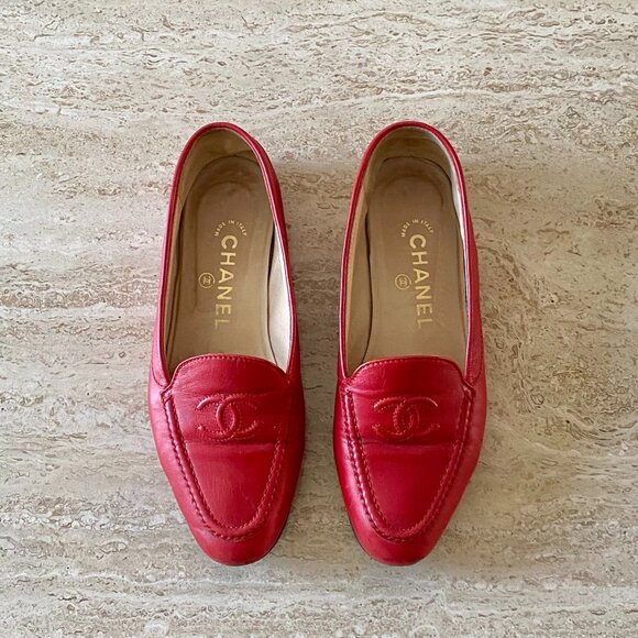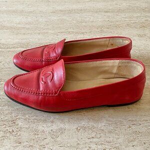 Vintage Chanel red lambskin leather CC loafers. Size 36 (runs small).