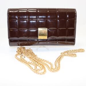 Authentic vintage Chanel Chocolate Bar Wallet on Chain in glossy brown patent leather with signature quilted “chocolate bar” pattern. Features gold-tone hardware with CHANEL engraved clasp. Interior includes multiple compartments and a zip pocket. Date code: 7761731 (early 2000s era).