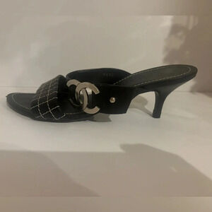 Authentic Vintage Chanel Kitten Heel Sandals with Interlocking CC logo. Leather, with metal hardware. One scuff on right toe cap (pictured). Light signs of wear. Very good condition. No box or dust bag.