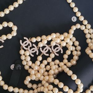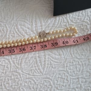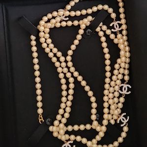 Vintage Chanel necklace 41.5 inches long. it can be worn as double long strands or triple strand necklaces. Pearl color is a vintage champagne (not white). April 2021 had it sent to Chanel after sales service for restringing pearls and replacing stones. It is a very old necklace and pearls show expected wear that would be noticeable under careful inspection but not noticeable while wearing it. It does not have a stamp but PM will authenticate. Perfect for valentines 💝 ❤️