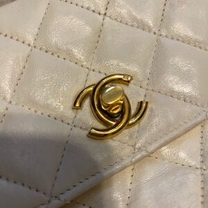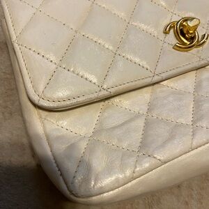 This exquisite CHANEL crossbody bag showcases a luxurious cream leather exterior adorned with the iconic diamond quilted pattern. The elegant gold-tone chain strap and signature CC turn-lock closure add a touch of sophistication, making it a versatile accessory for any occasion. Needs some love. Exterior has been painted and is not perfect, but very nice! Can be left as is or redone. Leather in upper right corner is more hardened than the rest of bag. Interior is also peeling. Vintage gold plated edition. Has serial code. Smaller size. Please message with any questions :)