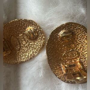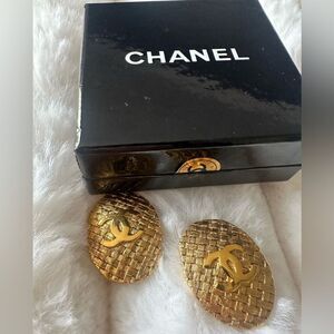 These exquisite CHANEL earrings feature a luxurious gold tone with a distinctive quilted pattern, showcasing the iconic interlocked CC logo.